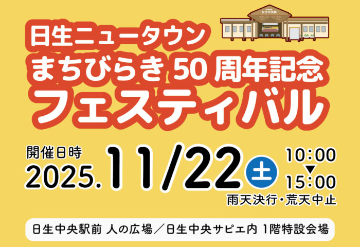 日生ニュータウンは今年、まちびらき50周年を迎えます。これまでの思い出を大切にしながら、これからのまちを考える、みなさんと一緒に楽しめるイベントを企画しました。11/22(土)は日生中央駅前にお越しください。 【概要】日 … 続きを読む 日生ニュータウンまちびらき50周年記念フェスティバル