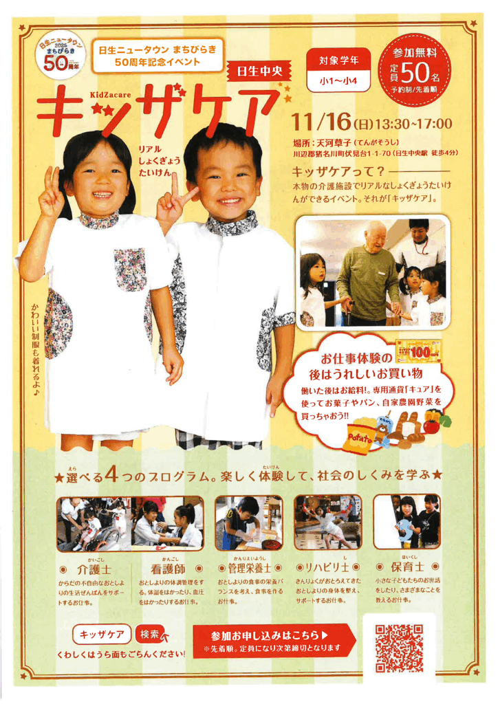 「キッザケア」で職業体験しよう!本物の介護施設でリアルな職業体験ができるイベント。それが「キッザニア」。「介護士・看護師」「管理栄養士」「リハビリ士」「保育士」から3つを体験いただけます。お仕事の後はお給料でもらった専用通貨「キュア」を使ってお菓子やパン、自家農園野菜を買っちゃおう!