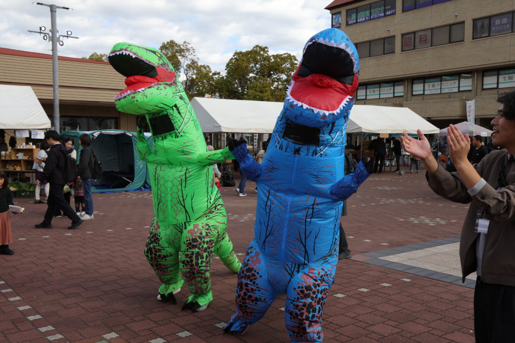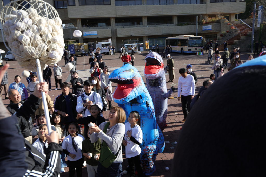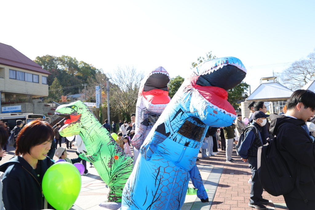 開会式では、大島太鼓の演奏から始まり、バルーンリリースで華やかなスタートになりました。人の広場では、地元野菜の販売や野菜の重さ当てゲーム、高校生達によるステージ企画、地元の方のパフォーマンス、玉入れ競技、ティラノサウルスの他、キッチンカーでの飲食の提供がありました。